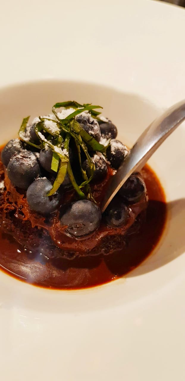 La torta de chocolate húmedo te explota en la boca, este acompañado de arándanos albahaca y salsa de chocolate y decorado con azúcar impalpable.