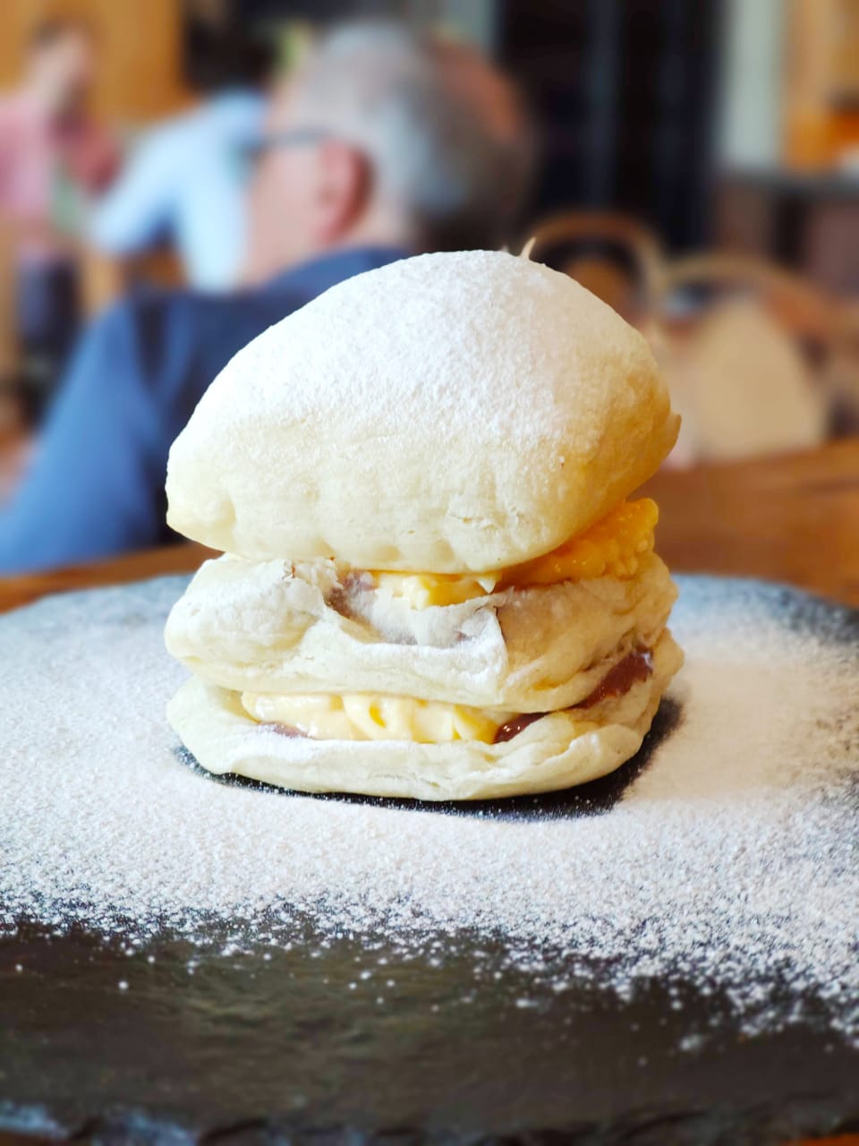 Las mil hojas infladas este relleno de crema pastelera y chocolate y decorado con azúcar impalpable.